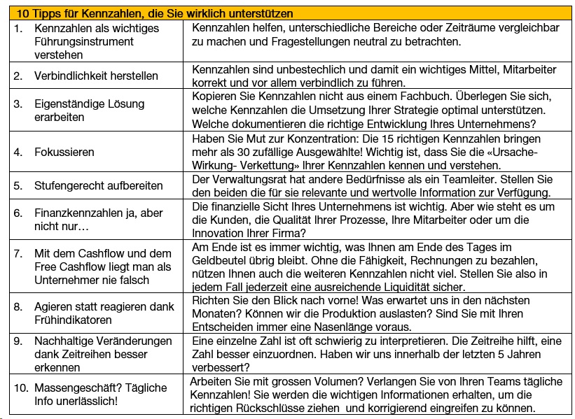 Zum Thema gibt es wohl fast so viele Philosophien wie Berater oder Projektleiter. Wir können Ihnen deshalb an dieser Stelle keine Anleitung zum «richtigen» Kennzahlensystem geben. Wir haben aber versucht, 10 Punkte zusammenzustellen, mit denen wir – bei der gemeinsamen Erarbeitung mit unseren Kunden – gute Erfahrungen gemacht haben.